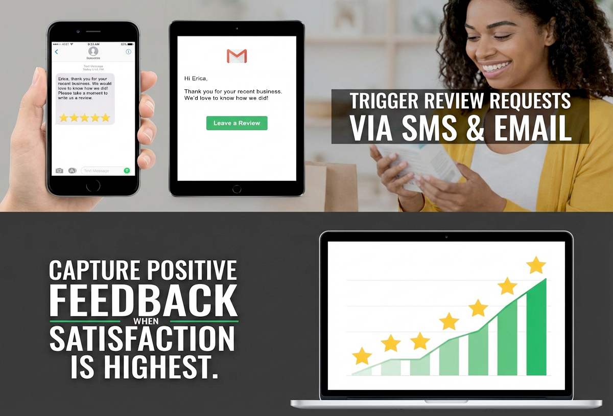 Trigger review requests through SMS and email to capture positive feedback when customer satisfaction is highest, helping you grow ratings naturally and consistently.